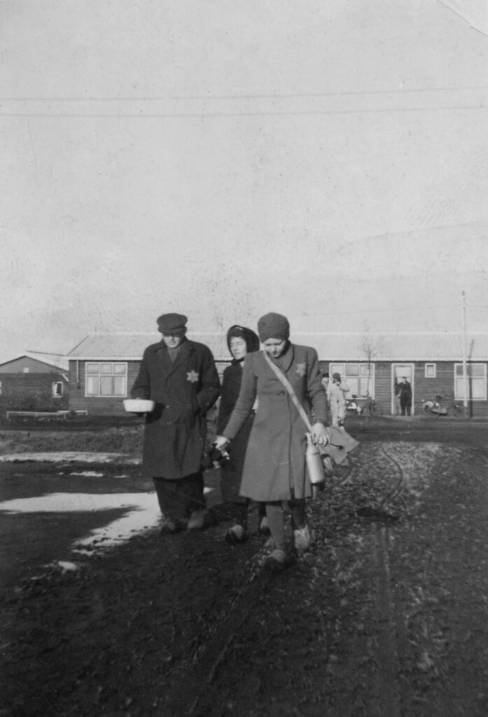 Eltern mit ihrer Tochter auf Holzschuhen auf einem der schlammigen Wege im „Polizeilichen Durchgangslager“ Westerbork. Sie haben einen Topf mit Essen geholt.