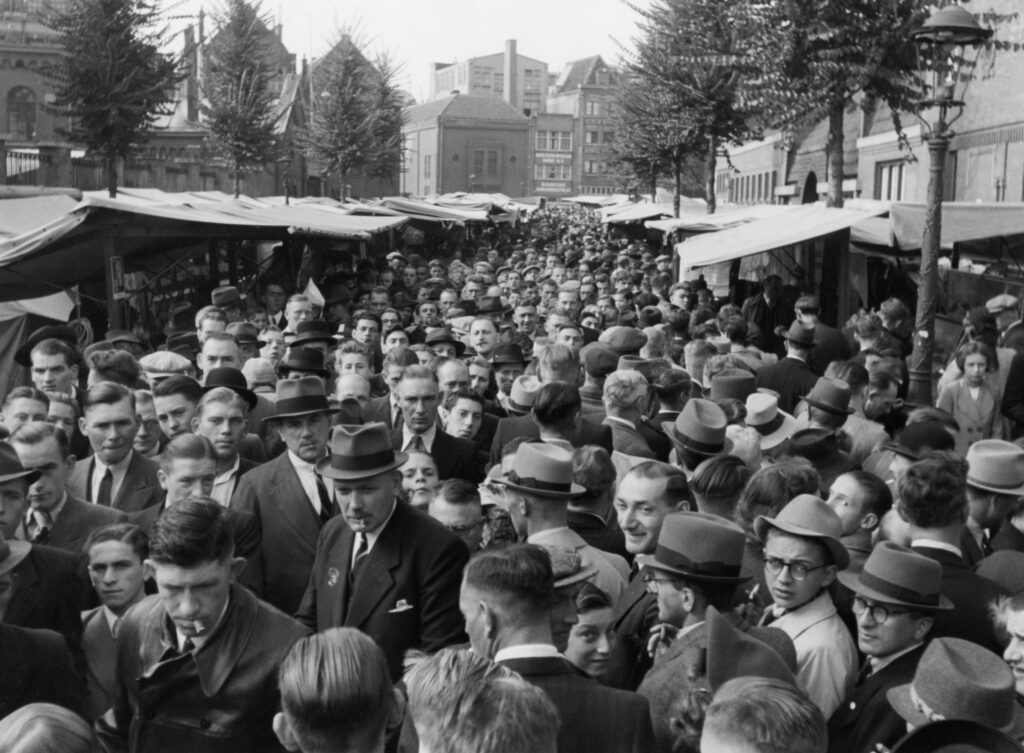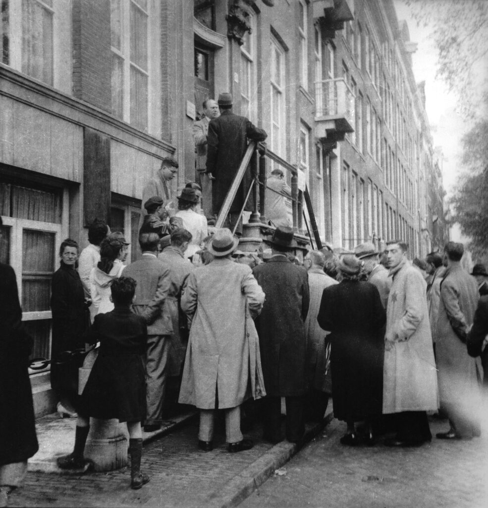 Gedränge vor dem Eingang zum Hauptgebäude des „Jüdischen Rats“ an der Nieuwe Keizersgracht 58 in Amsterdam. Täglich warten hier Menschen mit Bittschriften, Anträgen und Fragen. Vor allem der Erhalt oder die Verweigerung des begehrten „Sperre-Stempels“ führt zu heftigen Emotionen. Der Stempel gewährt bis auf Weiteres die Freistellung von der Deportation. Er bietet also keine Garantie, aber ein Aufschub ist schon viel wert.