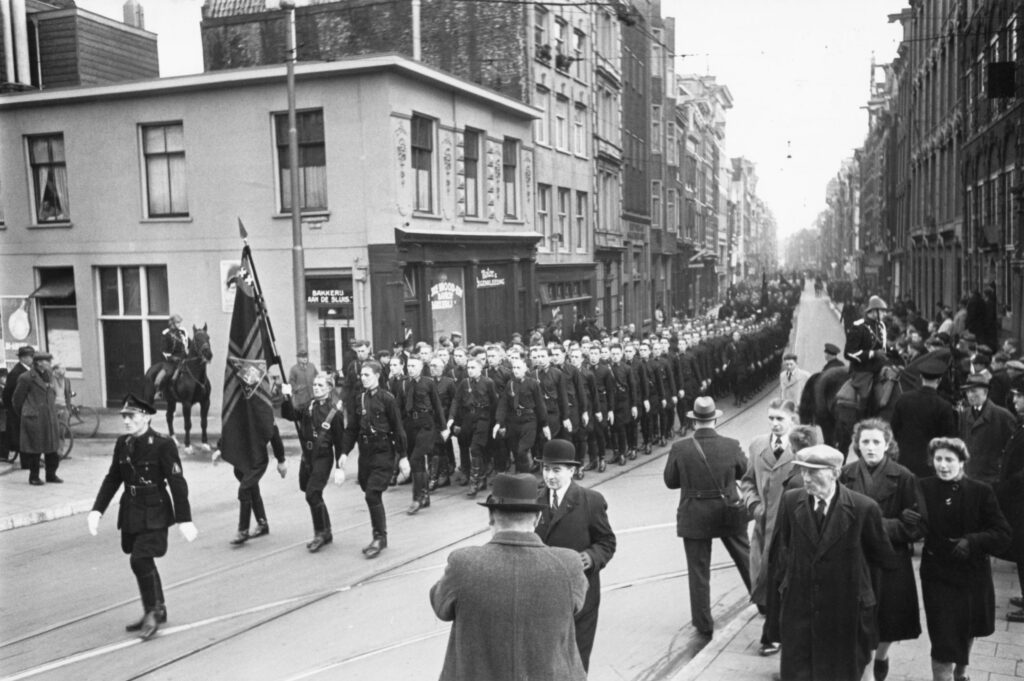 Viertausend Angehörige der Weerbaarheidsafdeling / WA (Wehrabteilung) der Nationaal-Socialistische Beweging / NSB (Nationalsozialistische Bewegung) auf einem Propagandamarsch durch Amsterdam. Am 9. November 1940 marschieren Angehörige der Weerbaarheidsafdeling / WA – der Miliz und Schlägertruppe der niederländischen nationalsozialistischen Bewegung NSB –, unter Polizeibegleitung provozierend durch das jüdische Viertel.
